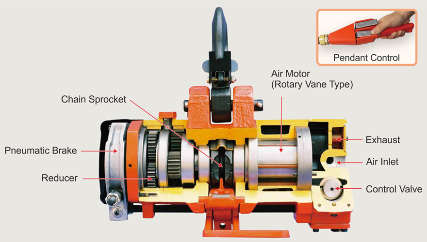 SAN-EI SEIKI’s popular rotary vane motor incorporated into our Air Hoist. The vanes cause the rotor to rotate when exposed to air pressure thus enabling the motor to raise and lower the load. Our vane motors are precise, rigid in construction that increases durability of our Air Hoist.
