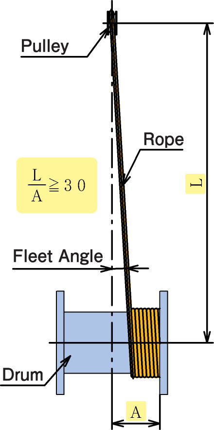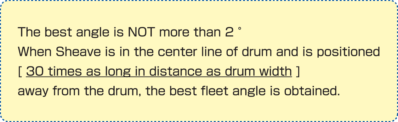 To determine fleet angle is necessary to keep the rope straight on the drum during wind-up. The angle between the center line through the lead sheave and the centerline of the rope leading to the drum is called as the fleet angle. Refer following right side figure.