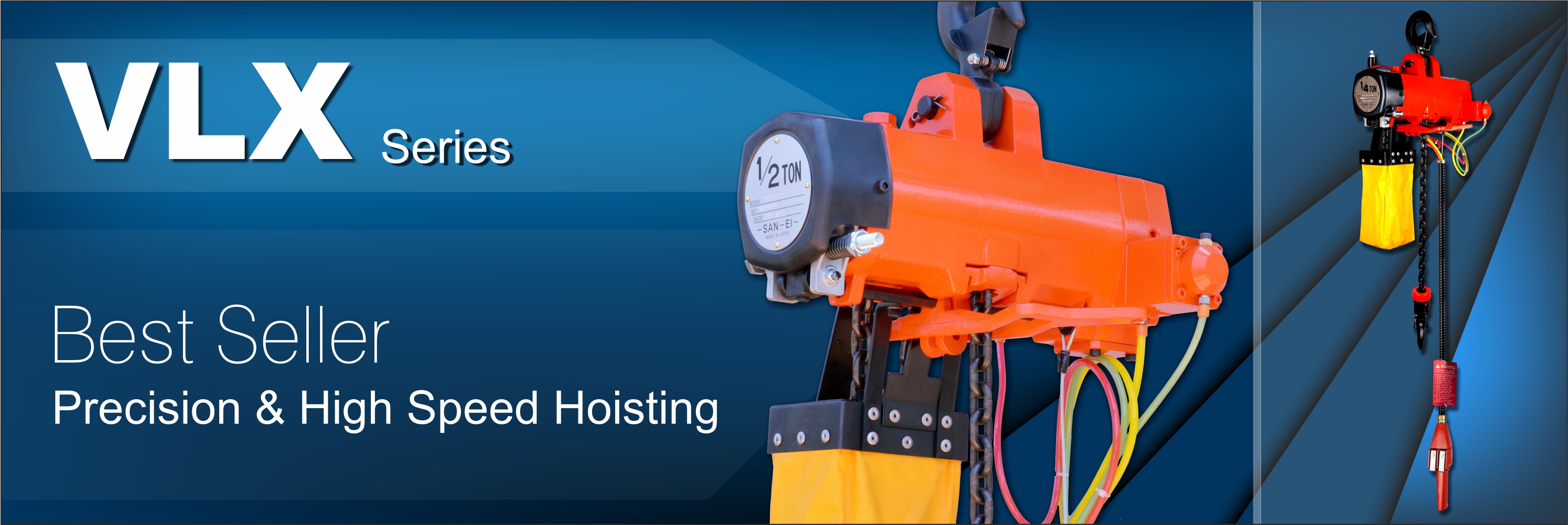 The Unique VLX Series “San-Ei” Vane motor air chain hoists have a 100% duty cycle, anti-friction bearings and have compact, light weight design. The speed of operation is infinitely variable from precise inching to high speed hoisting. These motors are designed for spark resistance qualities and work in robust environment. The chain guide gives maximum support with minimum chain wear and air hoist has brake design that works precisely for long life. The Japanese San-Ei Vane motor air hoists represent the optimum efficiency, safety and Value.