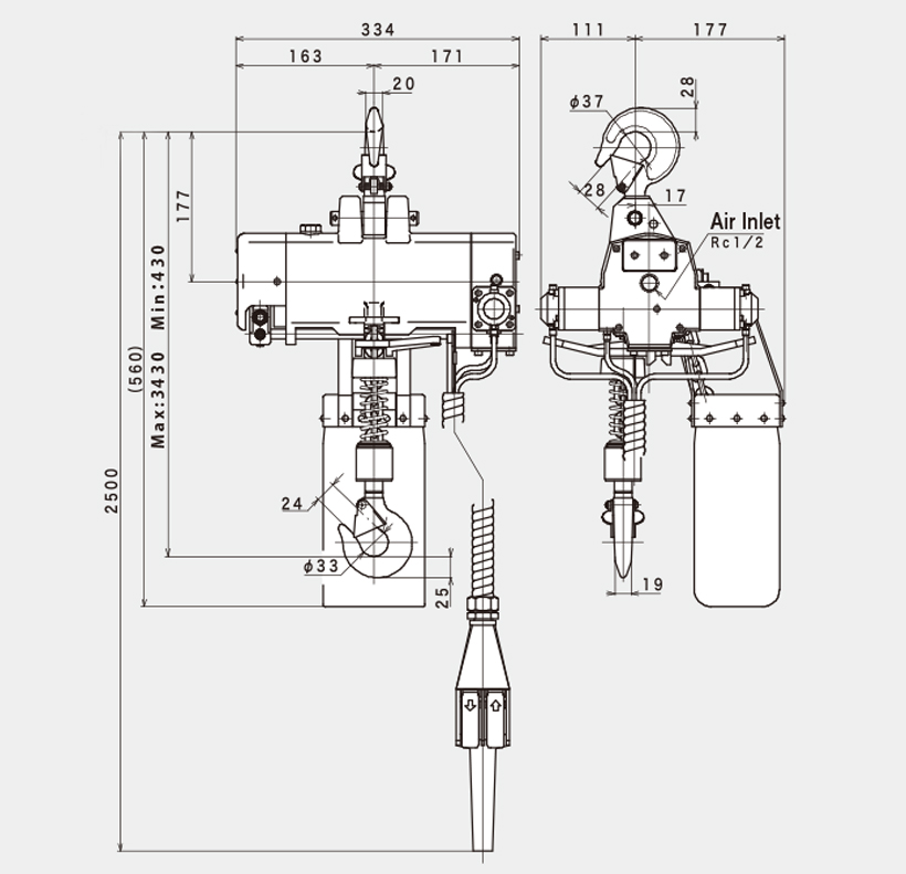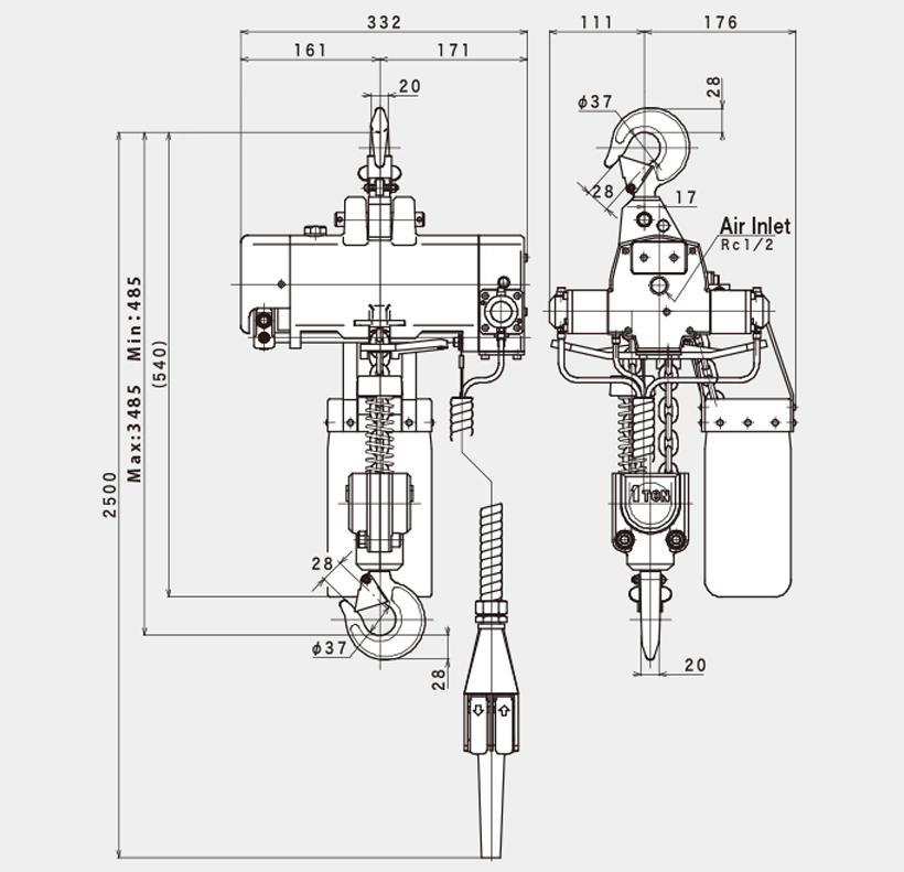 This series is designed to handle weight range from 125 Kg to 1 metric ton. These air hoists come standard with a pull chain control and have complete range of options. Lifts can be changed from standard 3 meters to as large as 20 meters for models VLX 25, 50 and 10 meters for VLX100. Further longer lifts are available optionally.